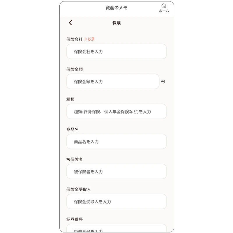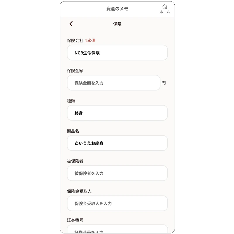 ※西日本シティ銀行の預金はアプリ連携で自動反映できます。詳細はアプリ内案内をご確認ください。 - 保険:保険会社名+種類(例:◯◯生命/終身保険)