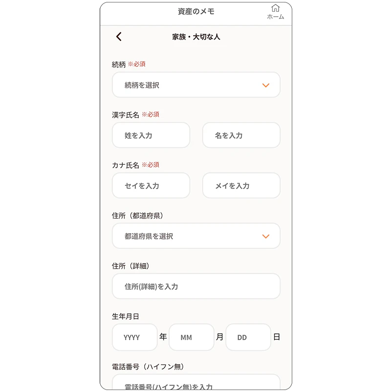 - 本機能は情報管理・共有のためのサービスであり、遺言・贈与契約などの法的効力は生じません。