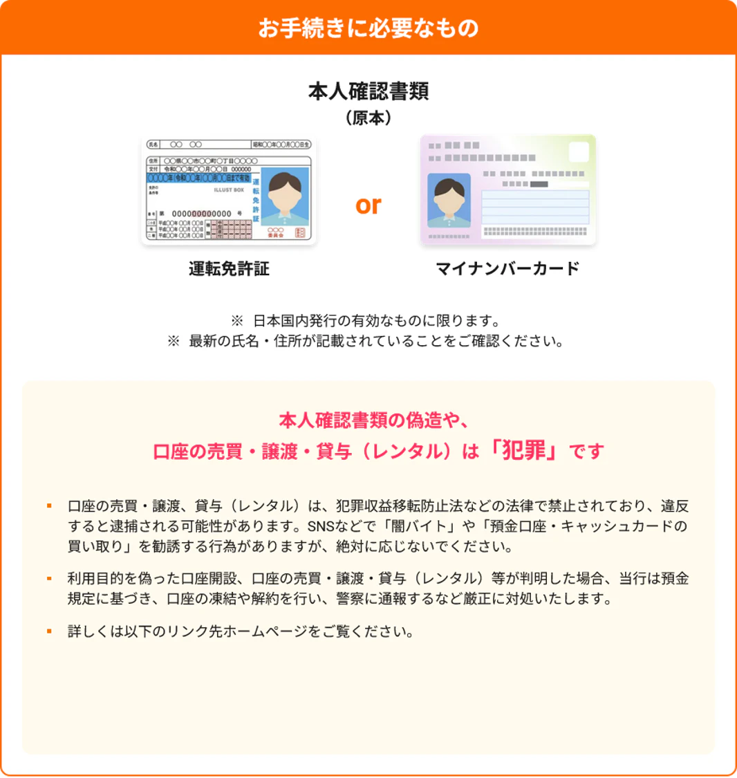 本人確認書類には最新の氏名・住所が記載されている必要があります。口座の売買や譲渡、貸与は法律で禁止されており、違反すると厳しい処分の対象となるため、絶対に行わないようにしてください。