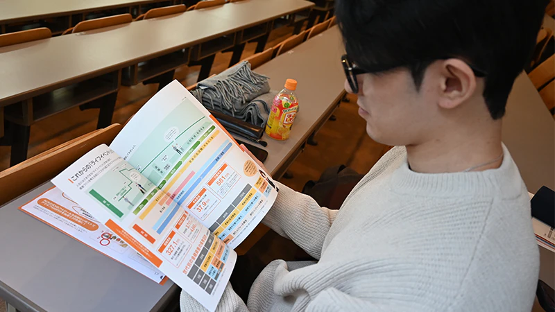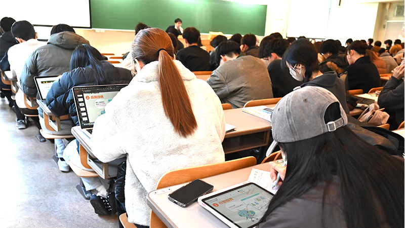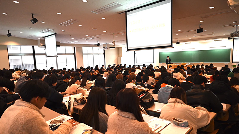 ひときわ冷え込んだ1月8日、西南学院大学の教室に学生が続々と集まってきました。セミナーの資料を受け取って席に着くと、さっそくパラパラとめくって内容を確認する学生も。ほぼ満席になった教室は、開始前から熱気に包まれていました。